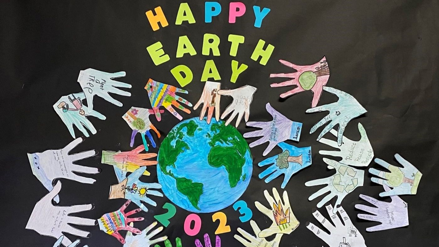 A school poster was created with the combined effort of students’ hands positioned around a colorful earth that stated, "Happy Earth Day 2023." The student messages remind us to be mindful and continue our commitment to protect the earth together.